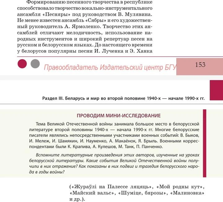 Также в учебнике нет ни слова о развитии беларусского национального движения. Нет полноценного разбора русификации — лишь краткое объяснение: «Принятая в 1961 г. Программа КПСС провозглашала целью партии развитие социалистического интернационализма как высшего качества всех советских людей. Предусматривалось слияние отдельных народов в единую коммунистическую мировую нацию, а их языков — в мировой язык». Никакого осуждения и рассказа о губительных для беларуского языка и культуры последствиях.