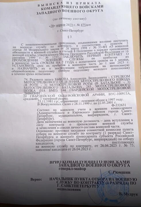 После этого рядового запаса Быкова зачислили стрелком в батальоне 283-го полка 144-й гвардейской мотострелковой дивизии. Это соединение входит в состав 20-й гвардейской общевойсковой армии Западного военного округа.
