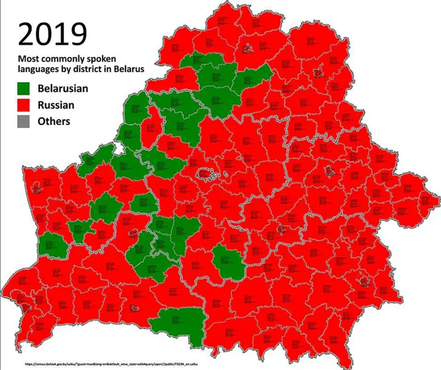 Моўная «роўнасьць» па-беларуску. Найбольш распаўсюджаная мова зносінаў насельніцтва Беларусі, паводле перапісу-2019: зялёны колер — беларуская, чырвоны — расейская. Схема: belstat.gov.by
