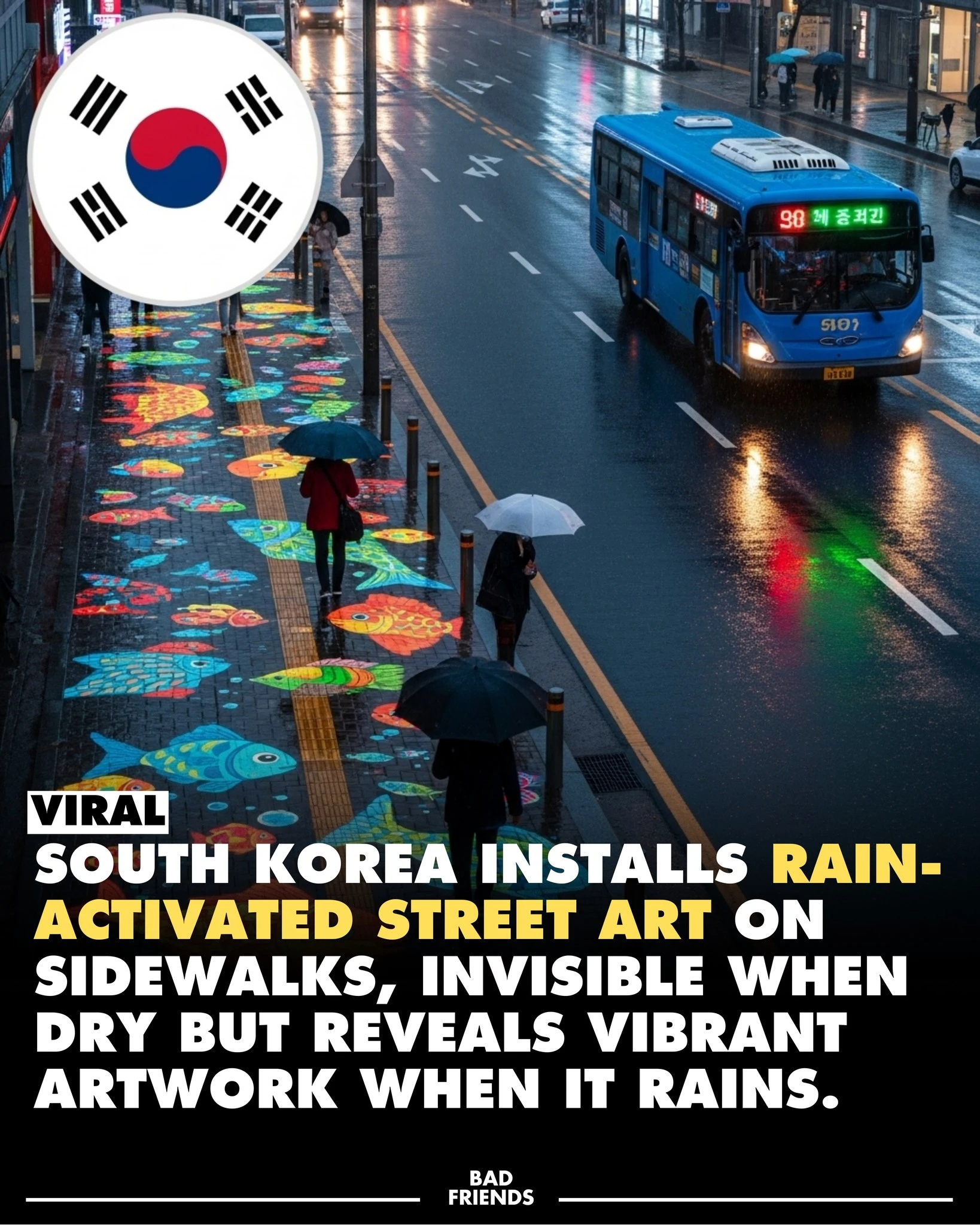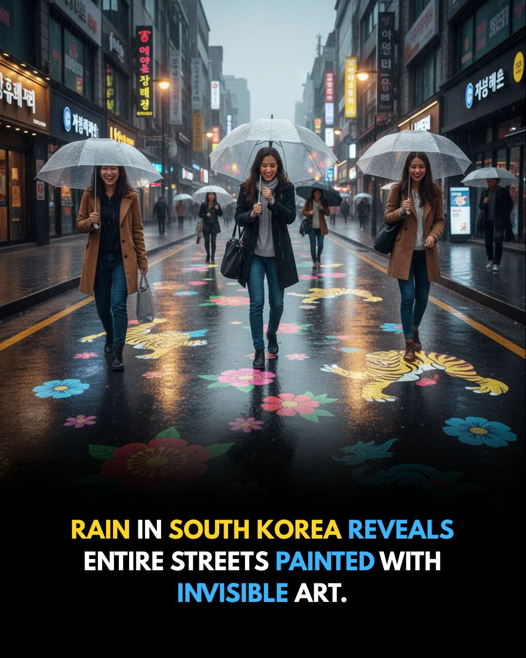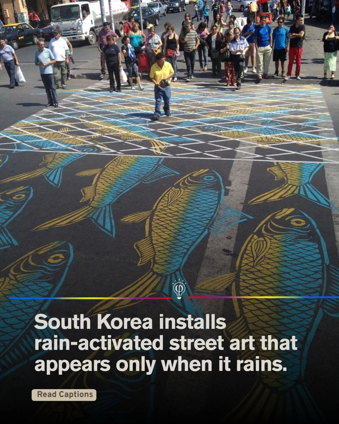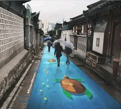 В Южной Корее дождь словно раскрашивает серый асфальт яркими красками. Вид уличного искусства под названием «Проект Муссон» (Project Monsoon) придумали и воплотили в жизнь корейские художники. Чтобы оживить мрачные дни муссонного сезона.