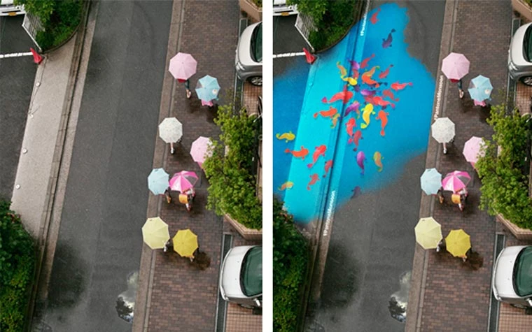 При создании веселых, «оживающих» под дождем картинок, дизайнеры использовали специальную гидрохромную краску. И привычные серые улицы превращались в настоящее визуальное пиршество из разноцветных китов, черепах и рыб.