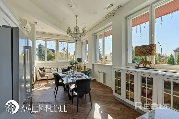 «Жилая часть — два автономных этажа с 5 комнатами, двумя мастер-спальнями, просторной кухней, гардеробными и современной гостиной-столовой-кухней с панорамными окнами. Четыре санузла: один VIP с ванной, биде и душевой кабиной. Два с ваннами и биде. Один с душевой кабиной», — указано в объявлении.