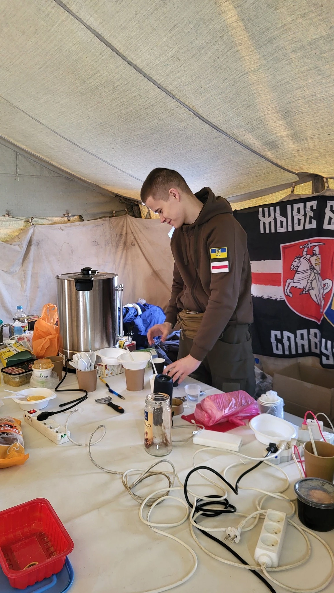 Валанцёрка Алена Жаркевіч апублікавала фота беларуса Аляксея Капліча падчас яго працы ў беларускім Пункце нязломнасці ў Кіеве.